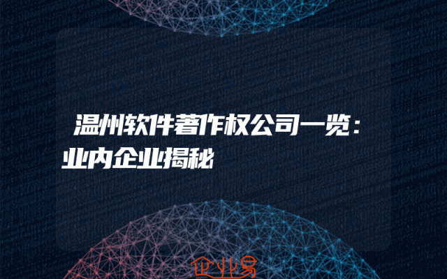- 温州软件著作权公司一览:业内企业揭秘一、市场现状与发展趋势随着信息技术的快速发展,温州的软件产业正在蓬勃兴起。软件著作权作为软件产业的核心要素之一,越来越受到企业的重视。在温州,一批专业从事软件著作权业务的公司如雨后春笋般涌现,它们