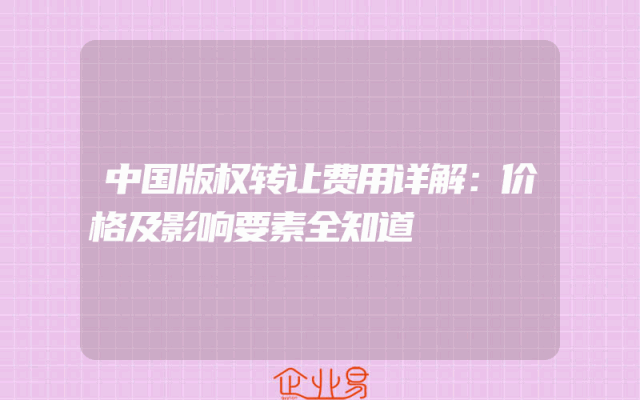 - 中国版权转让费用详解:价格及影响要素全知道一、版权转让费用的基本概念在中国,版权转让费用是指版权所有者将其作品的所有权、使用权和收益权等权利转让给他人时,按照一定标准收取的费用。版权转让费用的计算涉及多个因素,包括作品的类型、作品的质量、市