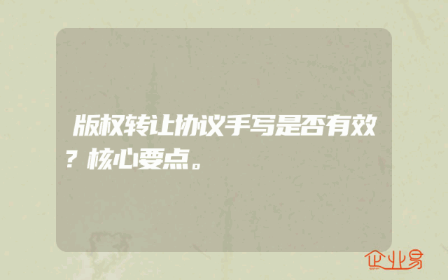 - 版权转让协议手写是否有效?核心要点解析一、版权转让协议的基本概述版权转让协议是知识产权领域常见的一种合同形式,用于规定版权所有人将其作品的所有权转让给他人的行为。随着数字化时代的到来,版权转让的方式日趋多样化,但手写协议仍然是一种常见的签署