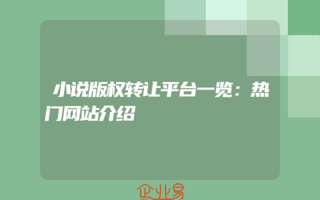 - 小说版权转让平台一览:热门网站介绍一、概述随着网络文学产业的快速发展,小说版权转让已成为行业的一个重要环节。为了更好地满足各方的需求,许多小说版权转让平台应运而生。这些平台提供了丰富的资源、便捷的交流和安全的交易环境,为版权所有者与潜在买家