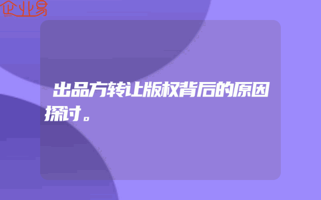 - 出品方转让版权背后的原因探讨一、商业利益的追求在当前的商业环境下,出品方转让版权,往往首先是出于商业利益的追求。出品方通过转让版权,可以获得丰厚的经济回报,进一步实现其商业价值。特别是在作品完成创作后,出品方可能希望通过版权转让,将潜在的市