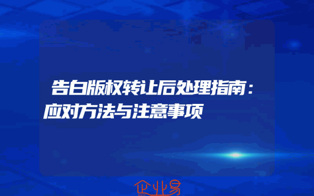 - 告白版权转让后处理指南:应对方法与注意事项了解版权转让概念及重要性版权转让是指知识产权所有者将其著作权利转移给另一方的法律行为。在告白行业中,版权问题尤为重要,因为涉及到创意、设计、文案等核心内容的归属和使用权。了解版权转让后的处理指南,不