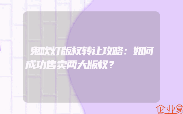 - 鬼吹灯版权转让攻略:如何成功售卖两大版权?一、了解版权及市场现状在谈论如何成功售卖两大版权之前,首先需要深入了解版权的相关法律常识以及当前的市场状况。版权是一种知识产权,涉及到作品(如文学作品、影视作品等)的原创性和所有权问题。在售卖版权之