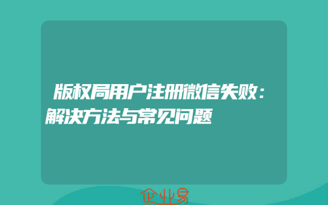 - 版权局用户注册微信失败:解决方法与常见问题解析版权局用户注册微信失败的问题对于用户来说无疑是一个不小的困扰。本文将从多个角度阐述这一问题,并针对常见的失败原因提供相应的解决方法。希望能够帮助遇到这一问题的用户找到合适的方法解决问题,顺利完成