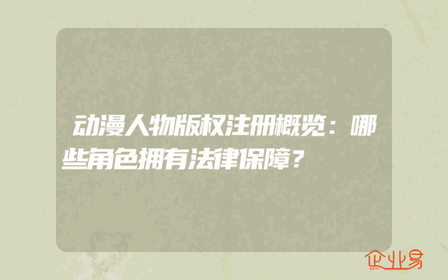 - 动漫人物版权注册概览:哪些角色拥有法律保障?一、动漫人物版权的重要性随着动漫产业的迅速发展,动漫人物的形象、设计及其衍生品成为重要的商业价值来源。因此,保护动漫人物版权成为行业内外关注的焦点。版权注册是保护动漫人物的重要手段,它能为创作者和