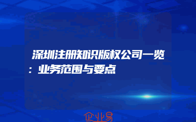 - 深圳注册知识版权公司业务一览:业务范围与要点解析一、知识版权公司注册概述在深圳这座充满活力的城市,随着科技创新的日新月异,知识产权保护显得尤为重要。不少企业家因此看到商机,纷纷选择注册成立知识版权公司。此类公司主要提供知识产权的咨询、登记、