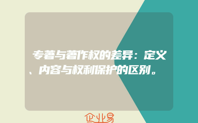 - 专著与著作权的差异解析:定义、内容与权利保护的区别一、定义专著通常是指某一特定领域或主题的详细、深入的研究著作,是作者在某一专业领域内的研究成果的集结。而著作权,又称为版权,是指创作者对其创作的文学、艺术和科学作品所享有的专有权利。