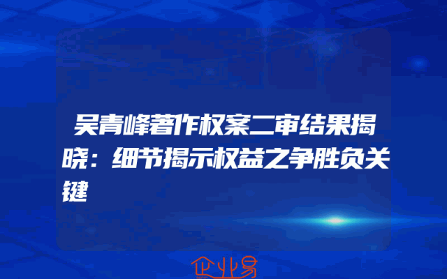 - 吴青峰著作权案二审结果揭晓:细节揭示权益之争胜负关键一、案件背景及二审结果揭晓近期,备受关注的吴青峰著作权案二审结果终于揭晓,此案引发了社会广泛讨论和关注。吴青峰的著作权权益之争,不仅是个人权益的争夺,更是整个社会对著作权保护意识的体现。二