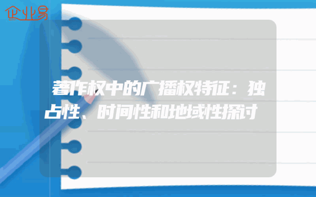 - 著作权中的广播权特征解析:独占性、时间性和地域性的探讨一、引言在知识产权领域,著作权是一项重要的法律权利,其中广播权作为著作权的一种重要形式,具有其独特的法律特征。本文将围绕广播权的独占性、时间性和地域性三大特征展开探讨,以深入理解广播权在