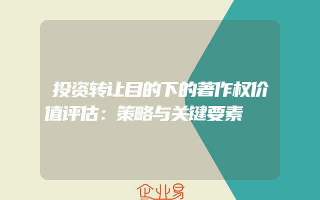 - 投资转让目的下的著作权价值评估:策略与关键要素解析一、著作权价值评估在投资转让中的重要性在知识产权日益受到重视的今天,著作权作为知识产权的重要组成部分,其在投资转让中的价值评估显得尤为重要。这不仅关乎投资双方的利益分配,更涉及到知识产权市场