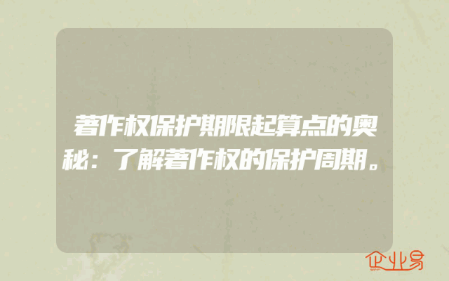 - 著作权保护期限起算点的奥秘:了解著作权的保护周期著作权作为知识产权的重要组成部分,对于保护原创作品具有重要意义。本文将深入探讨著作权保护期限起算点的奥秘,帮助读者更好地了解著作权的保护周期。一、著作