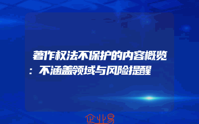 - 著作权法不保护的内容概览:不涵盖领域解析与风险提醒一、引言著作权法作为保护创作者权益的重要法律,其涉及范围广泛,但在某些领域和内容上,著作权法并不提供保护。了解这些不涵盖的领域及风险,对于创作者和企业来说至关重要。本文将详细解析著作权法不保