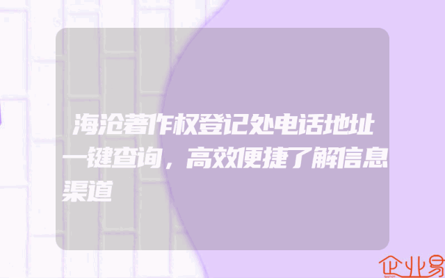 - 海沧著作权登记处电话地址一键查询——高效便捷了解信息渠道一、引言在知识产权保护日益重要的今天,著作权登记成为了创作者们保护自身权益的重要一环。对于位于海沧地区的创作者们而言,了解海沧著作权登记处的电话地址信息,是获取著作权登记相关服务的关键