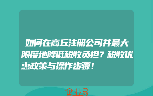 - 如何在商丘注册公司并最大限度地降低税收负担?税收优惠政策与操作步骤!