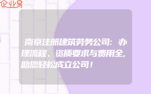 - 南京注册建筑劳务公司:办理流程、资质要求与费用全解析,助您轻松成立公司!在南京市,注册一家建筑劳务公司需要遵循一定的流程和满足一定的资质要求。本文将为您详细介绍南京注册建筑劳务公司的办理流程、资质要求以及相关费用,帮助您轻松成立公司。一、办