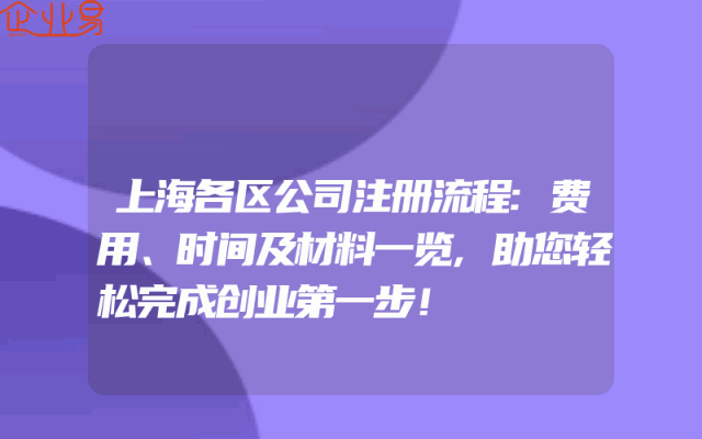 - 上海各区公司注册流程详解:费用、时间及材料一览,助您轻松完成创业第一步!一、公司注册流程简介在上海注册公司,您需要遵循一定的流程。本文将为您详细介绍上海各区的公司注册流程,包括费用、时间以及所需材料,帮助您轻松完成创业的第一步。二