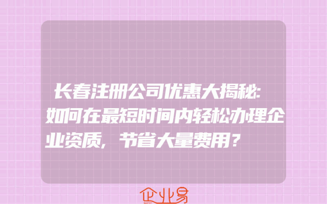 - 长春注册公司优惠大揭秘:如何在最短时间内轻松办理企业资质,节省大量费用?在长春这座美丽的城市里,越来越多的创业者选择在这里设立自己的企业。然而,要想在市场上立足,拥有一份合法的企业资质是必不可少的。那么,如何在最短时间内轻松办理企业资质,节
