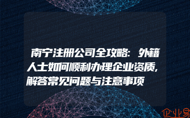 - 南宁注册公司全攻略:外籍人士如何顺利办理企业资质,解答常见问题与注意事项在南宁注册公司的过程中,外籍人士可能会遇到一些特殊的问题。本文将为您提供一份详细的攻略,帮助您顺利办理企业资质,并解答一些常见问题与注意事项。一、准备工作1.了解当地政