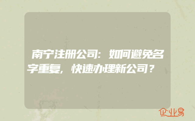 - 南宁注册公司:如何避免名字重复,快速办理新公司?在南宁注册公司的过程中,很多创业者都会遇到一个问题,那就是公司名称的重复。这个问题可能会导致你的公司无法顺利注册,甚至可能会影响到你的公司的发展。那么,如何避免这个问题呢?本文将为你提供一些