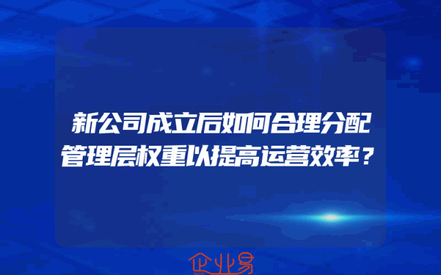 - 新公司成立后如何合理分配管理层权重以提高运营效率?在企业运营中,管理层的权重分配是一个至关重要的问题。合理的管理层权重分配可以提高企业的运营效率,促进企业的发展。那么,新公司成立后如何合理分配管理层权重以提高运营效率呢?本文将从以下几个方面