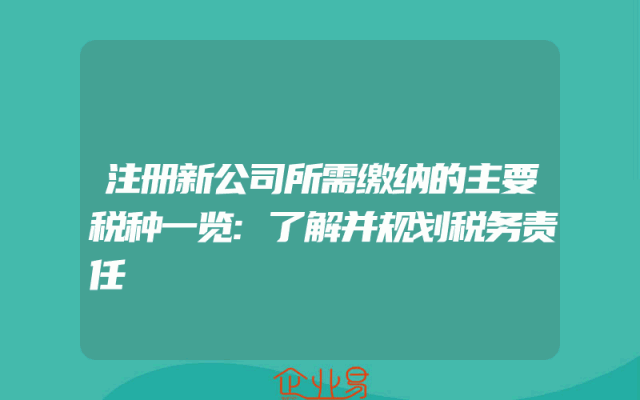 - 注册新公司所需缴纳的主要税种一览:了解并规划税务责任在注册新公司的过程中,了解并规划好税务责任是非常重要的一环。税务责任包括了公司需要缴纳的各种税种,如增值税、企业所得税、个人所得税等。本文将为您详细介绍注册新公司所需缴纳的主要税种,帮助您