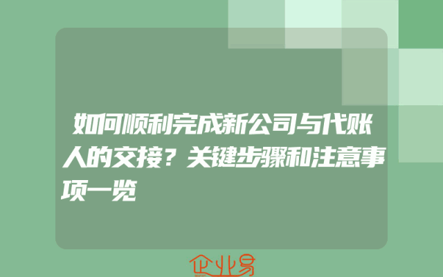 - 如何顺利完成新公司与代账人的交接?关键步骤和注意事项一览在企业运营过程中,代账人的交接工作是非常重要的一环。一个顺利的交接过程不仅可以保证业务的连续性,还可以避免因为信息传递不畅而导致的错误。那么,如何才能顺利完成新公司与代账人的交接呢?本