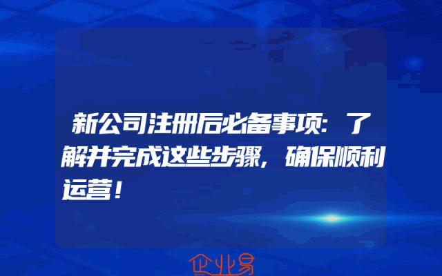 - 新公司注册后必备事项:了解并完成这些步骤,确保顺利运营!在创业的道路上,公司注册是一个至关重要的环节。新公司注册后,需要遵循一系列的步骤和规定,以确保公司的顺利运营。本文将为您详细介绍新公司注册后的必备事项,帮助您了解并完成这些步骤,为您