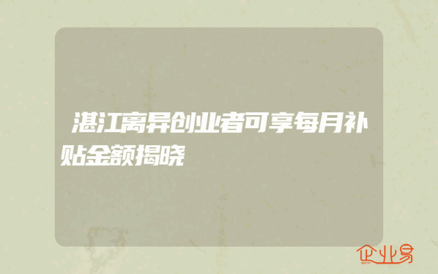 - 湛江离异创业者可享每月补贴金额揭晓湛江离异创业者迎政策利好在今天的时代,越来越多的人在经历生活变故后选择自主创业,这其中就包括湛江的离异创业者们。他们凭借坚韧不拔的精神和对未来的追求,成为创业领域的新生力量。好消息传来,湛江市政府针对离异创