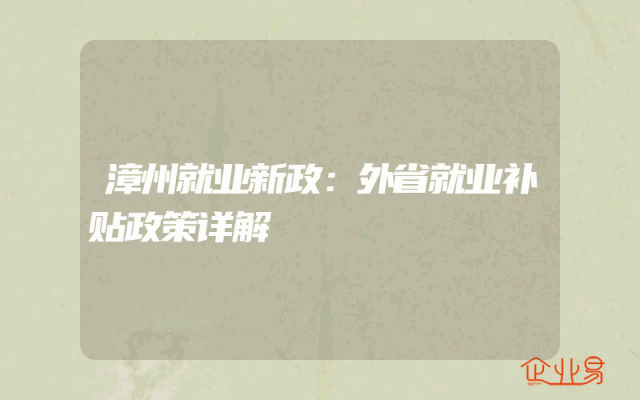 - 漳州就业新政:外省就业补贴政策详解一、漳州就业新政概述近年来,漳州市政府为鼓励居民充分就业,出台了一系列就业新政。其中,针对外省就业的人群,政府更是加大了补贴力度,旨在吸引和留住优秀人才在外地工作。二、具体的补贴政策内容针对在外省就业的漳州