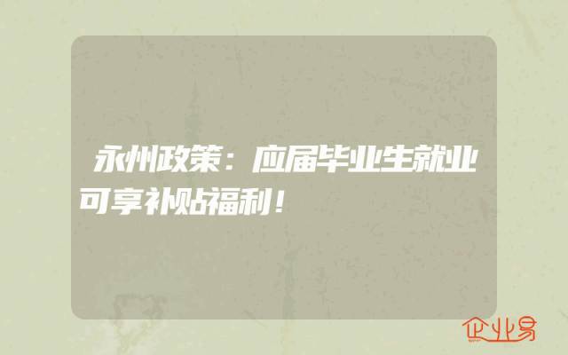 - 永州政策:应届毕业生就业可享补贴福利!一、政策概述为了促进本地高校毕业生就业,永州市政府出台了一系列优惠政策,鼓励应届毕业生积极就业。这一政策涵盖了多个方面,为即将步入职场的学子们提供了实实在在的福利。二、补贴内容详述对于在永州市就业的应届