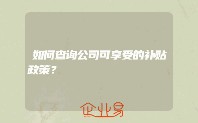 - 如何查询公司可享受的补贴政策?一、了解政策环境首先,查询公司可以享受哪些补贴政策的前提是对政策环境的了解。这包括国家层面、地方层面以及行业内部的各类扶持政策。可以通过政府官方网站、行业资讯平台、权威媒体等途径获取相关政策信息。二、筛选适用政