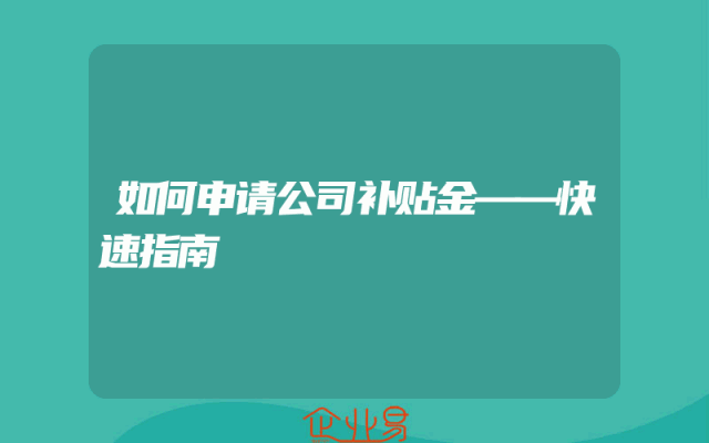 - 如何申请公司补贴金——快速指南了解补贴政策在开始申请公司补贴金之前,首先要对公司的补贴政策进行深入了解。不同的公司可能有不同的补贴政策,包括补贴的种类、申请条件、申请流程等。可以通过公司内部的通知、公告、人力资源部门或者公司的官方网站来获取