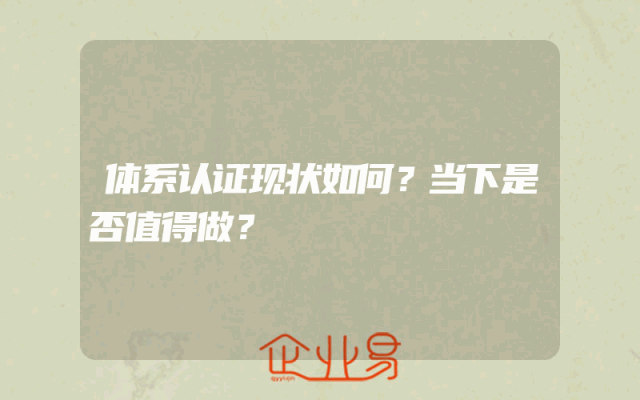 - 体系认证现状如何?当下是否值得做?一、体系认证的当前现状在当今的商业环境中,体系认证已经成为企业稳健发展的一个重要标志。随着全球化进程的加速,各类体系认证如ISO9001质量管理体系认证、ISO14001环境管理体系认证等逐渐成为企业运营的