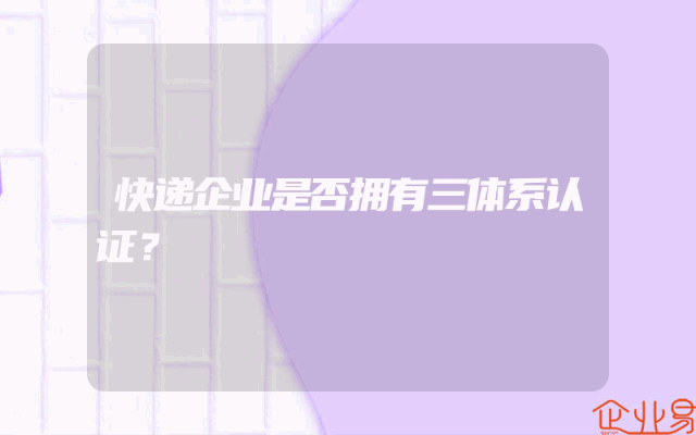 - 快递企业是否拥有三体系认证引言随着物流行业的快速发展,快递企业作为物流行业的重要组成部分,其服务质量和管理水平受到广泛关注。其中,企业是否拥有三体系认证是衡量其管理水平和服务质量的重要指标之一。三体系认证包括ISO质量管理体系认证、