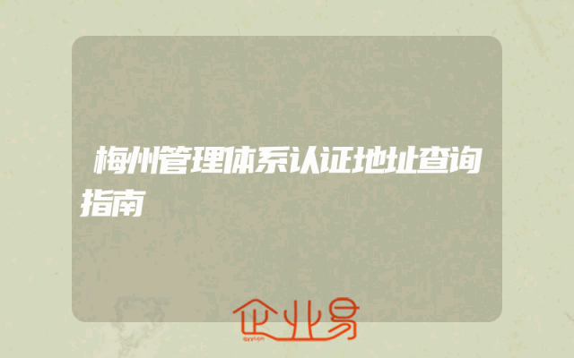 - 梅州管理体系认证地址查询指南一、引言随着企业服务行业的快速发展,管理体系认证已成为企业发展的重要一环。梅州作为广东省内的重要城市,其管理体系认证工作也日渐受到关注。为了帮助广大企业快速找到梅州市管理体系认证的地址信息,本文提供详细的