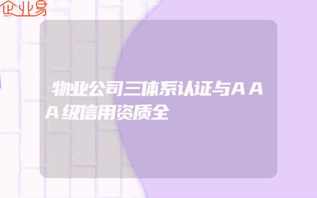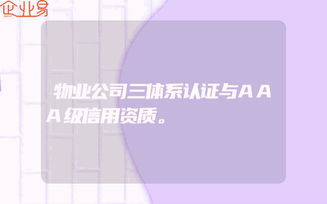 - 物业公司三体系认证与AAA级信用资质全解析一、物业公司三体系认证概述随着市场竞争的加剧,物业服务企业面临着不断提升服务质量和信誉度的挑战。在这一背景下,三体系认证成为物业公司展示自身实力、提升竞争力的重要途径。三体系认证主要包括质量管理体系