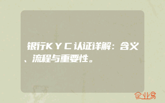- 银行KYC认证详解:含义、流程与重要性一、KYC认证的含义KYC(KnowYourCustomer)认证,即了解你的客户,是银行及其他金融机构在为客户提供服务前,必须实施的一项基础制度。它要求金融机构对客户的身份、背景、交易目的和交易性质进