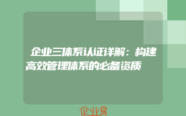 - 企业三体系认证详解:构建高效管理体系的必备资质一、引言随着市场竞争的日益激烈,企业为了提升自身竞争力,必须构建高效的管理体系。其中,企业三体系认证作为企业管理的核心资质,对于企业的长远发展具有重要意义。所谓企业三体系认证,指的是质量管理体系