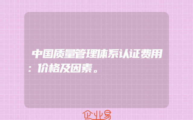 - 中国质量管理体系认证费用详解:价格及因素解析一、质量管理体系认证费用概述在中国,企业进行质量管理体系认证,是为了提高管理水平和确保产品质量的必要手段。关于质量管理体系认证的费用,是企业在考虑认证时必须面对的一个实际问题。认证费用涉及多个方面