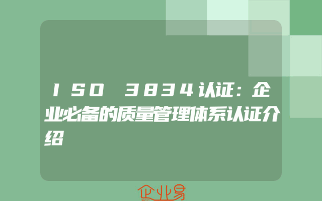 - ISO3834认证:企业必备的质量管理体系认证介绍一、ISO3834认证概述ISO3834认证是国际标准化组织(ISO)颁布的一项重要的质量管理体系认证标准。这一认证主要针对企业的质量管理活动,旨在确保企业生产过程和产品质量的稳定可靠,提升