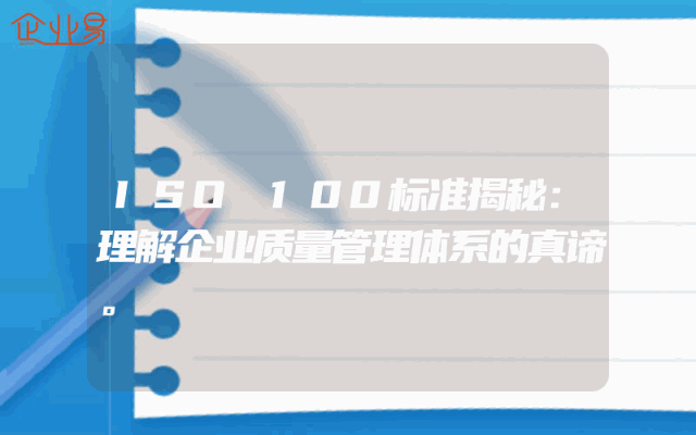 - ISO100标准揭秘:理解企业质量管理体系的真谛随着全球化和市场竞争的加剧,企业对质量管理的要求越来越高。作为保障企业产品服务质量和管理体系的有效工具,ISO质量管理体系标准备受关注。其中,ISO10