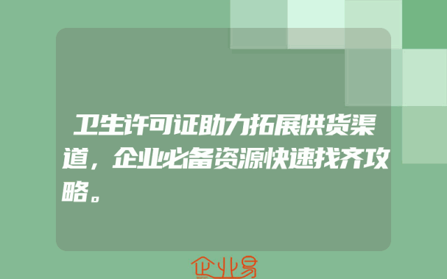 - 卫生许可证助力拓展供货渠道,企业必备资源快速找齐攻略。