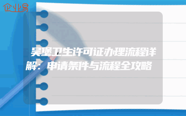 - 吴堡卫生许可证办理流程详解:申请条件与流程全攻略一、引言在吴堡地区,无论您的企业是大型集团还是小微初创,要想合法合规地开展业务,办理卫生许可证都是一项重要的法定程序。本文旨在为广大申请者详细介绍