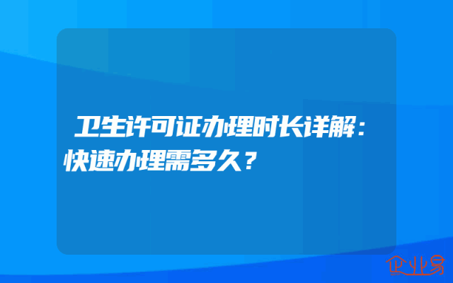- 卫生许可证办理时长详解:快速办理需多久?一、前言卫生许可证是企业经营的重要资质之一,涉及到食品、餐饮、医疗等多个行业。办理卫生许可证的时间因地区、行业和提交材料的差异而有所不同。本文将详细解析卫生许可证的办理时长,帮助您了解快速办理所需的时