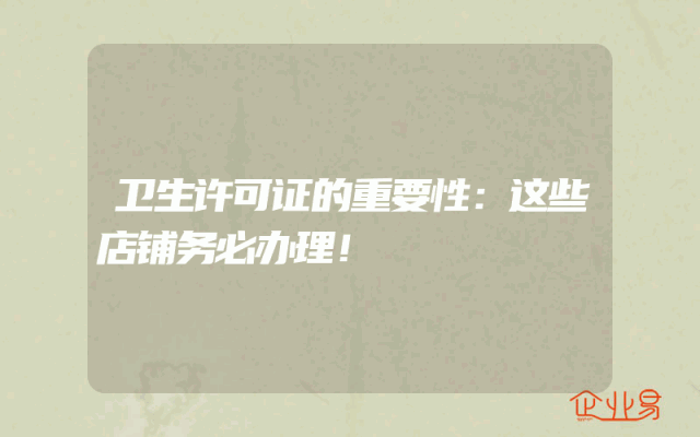 - 卫生许可证的重要性:这些店铺务必办理!一、引言随着经济的发展和社会的进步,各类店铺如雨后春笋般涌现。无论是餐饮店、超市还是药店等,为客户提供优质服务的同时,也必须严格遵守相关法律法规,确保卫生安全。其中,卫生许可证的办理显得尤为重要。二、卫