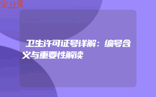 - 卫生许可证号详解:编号含义与重要性解读一、卫生许可证号概述卫生许可证号是由相关行政部门颁发,用于证明企业或产品满足卫生安全要求的证件编号。对于企业而言,卫生许可证号就如同一张“通行证”,意味着企业的生产经营活动得到了政府的认可,其产品可以在