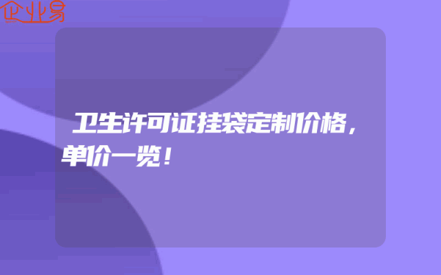 - 卫生许可证挂袋定制价格:单价一览一、引言随着企业运营对于合规性的日益重视,卫生许可证的规范管理也显得尤为重要。其中,卫生许可证挂袋作为展示企业卫生许可证的重要载体,其定制需求也日益增长。本文将详细介绍卫生许可证挂袋的定制价格及单价,以便企业