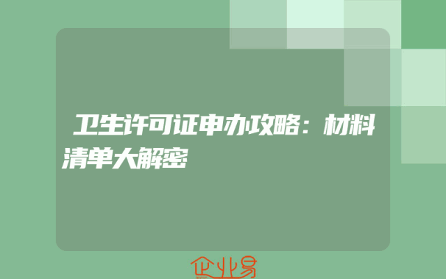 - 办卫生许可证所需材料清单:全面指南一、了解卫生许可证卫生许可证是企业或个体工商户在特定场所进行经营活动的重要资质证明,尤其在食品、医疗等与公众健康密切相关的行业更是必备证件。办理卫生许可证需要提供一系列的材料来证明你的场所符合卫生标准和要求
