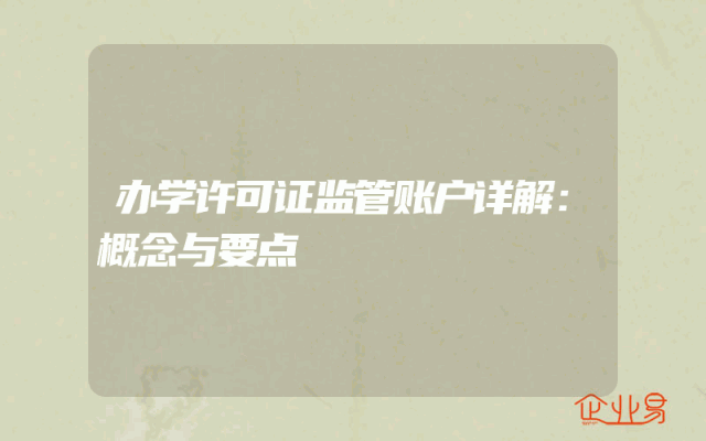 - 办学许可证监管账户详解:概念与要点解析一、办学许可证监管账户的概念在现代教育培训行业,办学许可证不仅是学校合法运营的证明,更是对其资金流转、教学质量等多方面的监管手段。其中,监管账户作为办学许可证制度的重要组成部分,其概念是指学校在