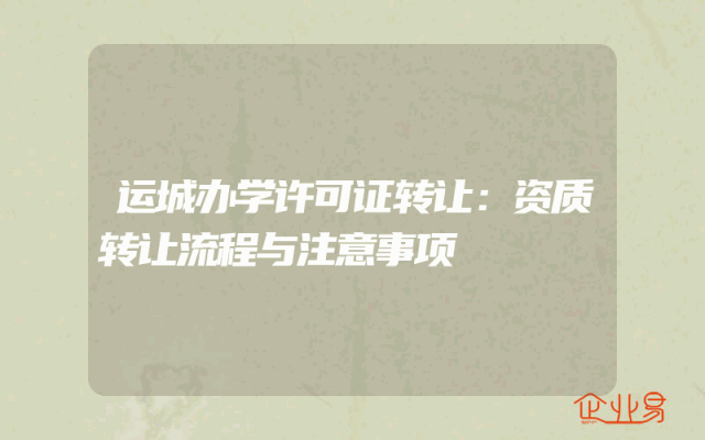 - 运城办学许可证转让:资质转让流程与注意事项一、引言随着教育市场的不断发展,办学许可证的转让逐渐成为一种常态。对于运城地区的办学机构而言,了解办学许可证的转让流程及相关注意事项至关重要。本文将详细阐述运城办学许可证转让的流程及应注意的事项,以